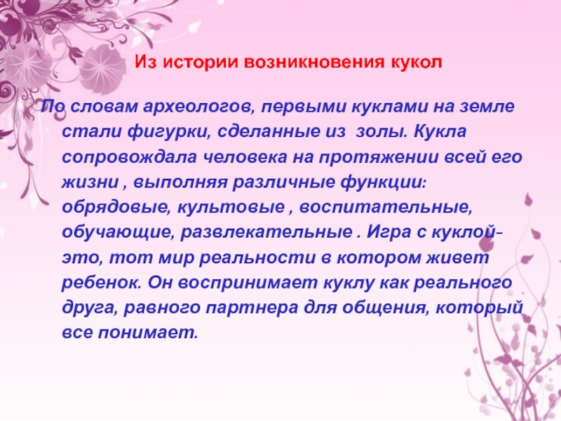 фигурки, сделанные из золы. Кукла сопровождала человека на протяжении всей его жизни , выполняя различные функции: обрядовые, культовые , воспитательные, обучающие, развлекательные . Игра с куклой- это, тот мир реальности в котором живет ребенок. Он воспринимает куклу как реального друга, равного партнера для общения, который все понимает.