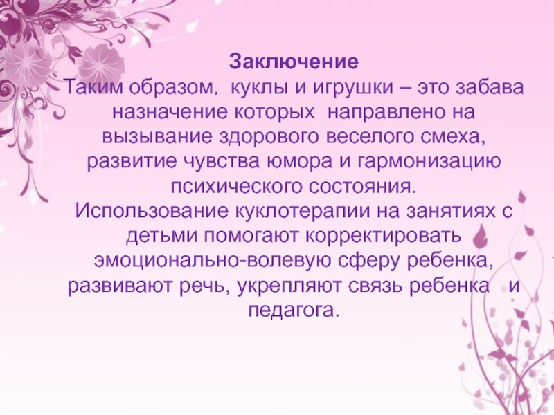 Заключение Таким образом, куклы и игрушки – это забава назначение которых направлено