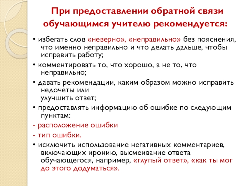 Слайд 23 При предоставлении обратной связи обучающимся учителю рекомендуется: