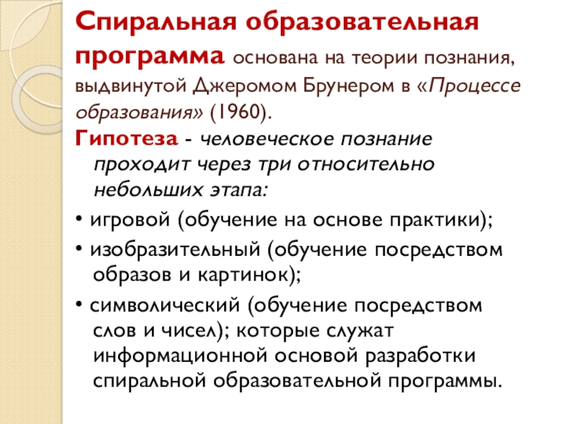 • символический (обучение посредством слов и чисел); которые служат информационной основой разработки спиральной образовательной программы.