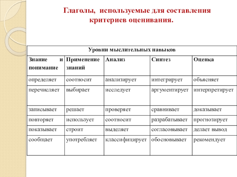 Слайд 20 Глаголы, используемые для составления критериев оценивания.