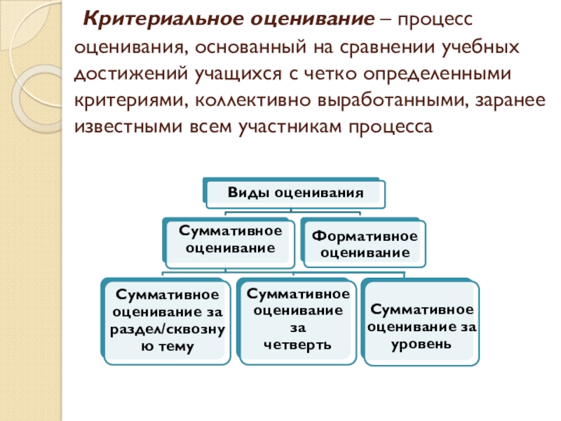 Слайд 19 Критериальное оценивание – процесс оценивания, основанный на сравнении учебных достижений