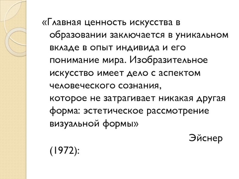 Слайд 2«Главная ценность искусства в образовании заключается в уникальном вкладе в опыт