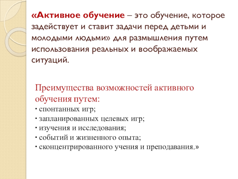 Слайд 18«Активное обучение – это обучение, которое задействует и ставит задачи перед