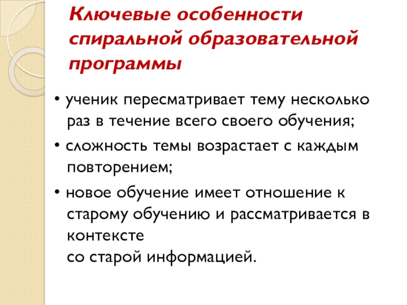 Слайд 11Ключевые особенности спиральной образовательной программы