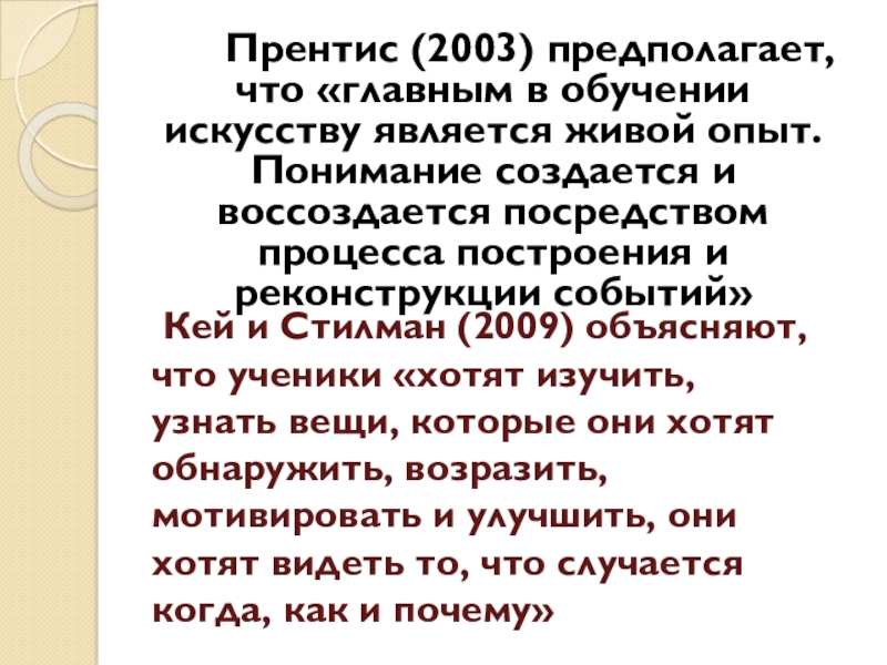 в обучении искусству является живой опыт. Понимание создается и воссоздается посредством процесса построения и реконструкции событий»