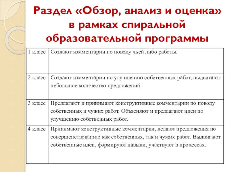 Слайд 13Раздел «Обзор, анализ и оценка» в рамках спиральной образовательной программы