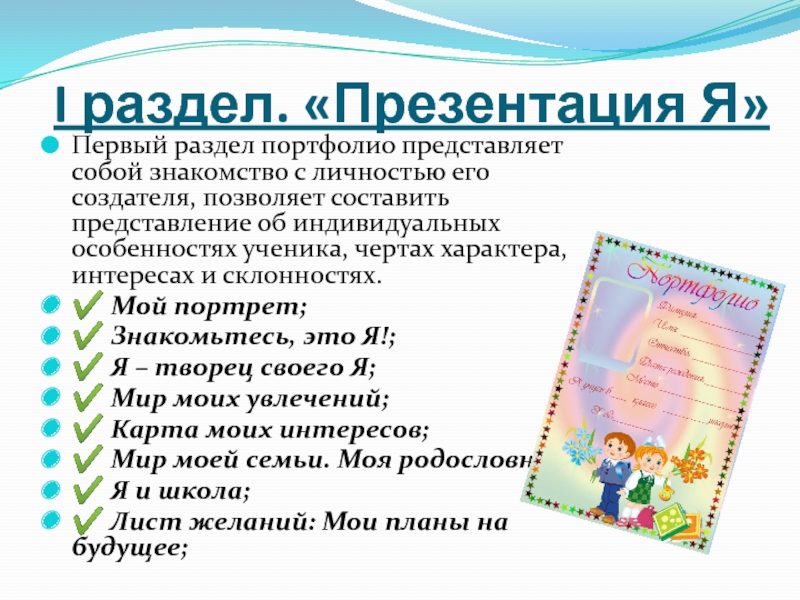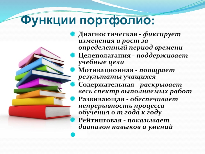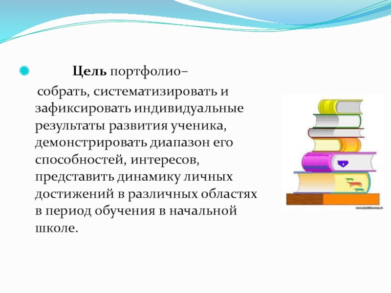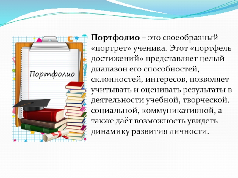Слайд 4Портфолио – это своеобразный «портрет» ученика. Этот «портфель достижений» представляет целый диапазон