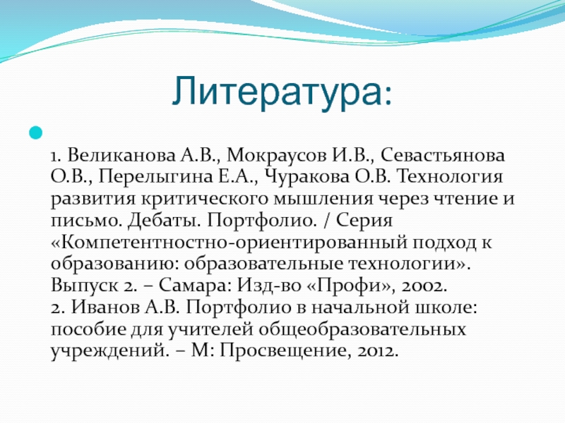Технология развития критического мышления через чтение и письмо. Дебаты. Портфолио. / Серия «Компетентностно-ориентированный подход к образованию: образовательные технологии». Выпуск 2. – Самара: Изд-во «Профи», 2002.