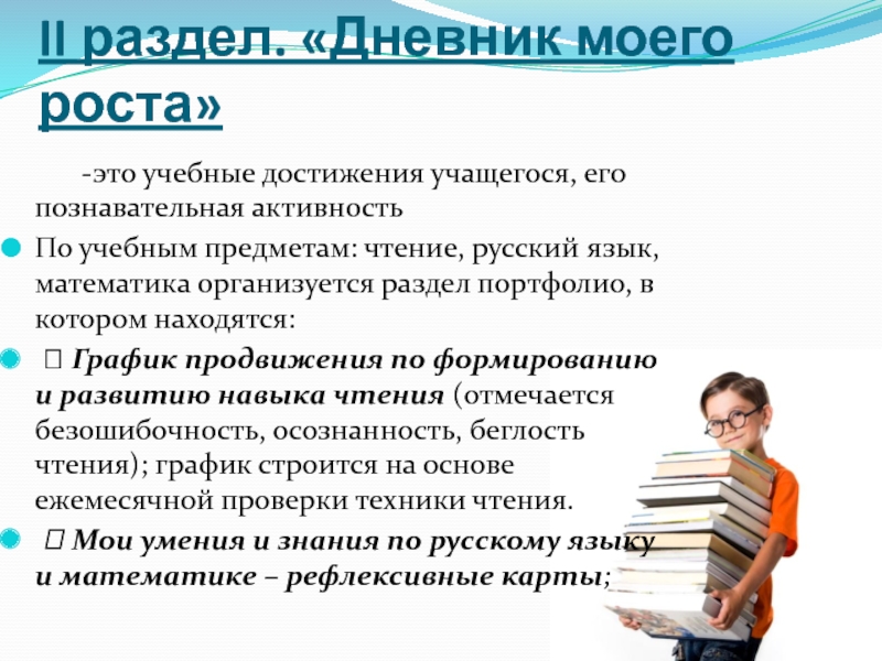 Портфолио отзывов – включает оценку своих достижений, проделанный им анализ различных видов учебной и внеучебной деятельности и ее результатов, резюме, планирование будущих образовательных этапов, а также отзывы, представленные учителями, родителями, одноклассниками, работниками системы дополнительного образования и др.