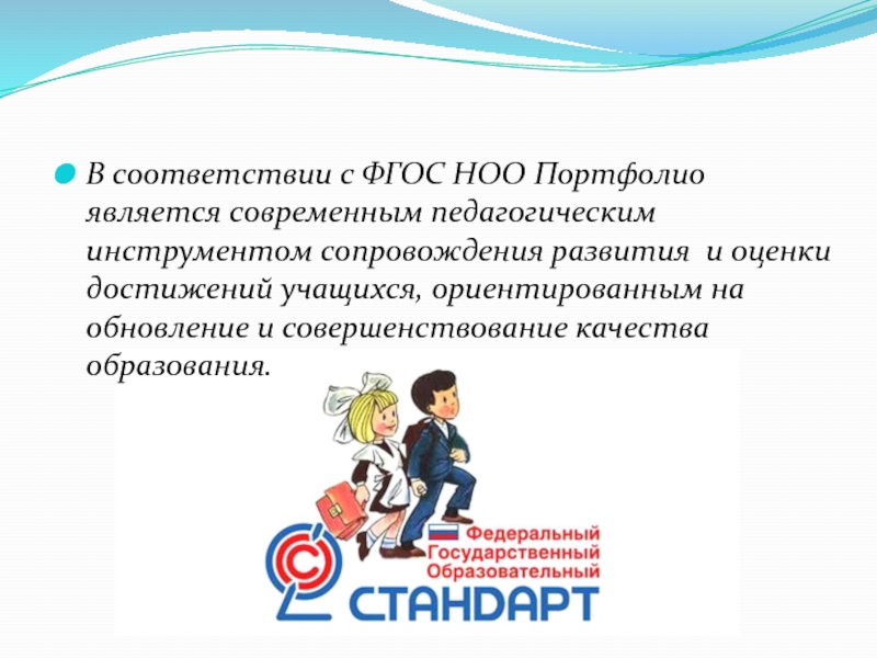 Слайд 2В соответствии с ФГОС НОО Портфолио является современным педагогическим инструментом сопровождения