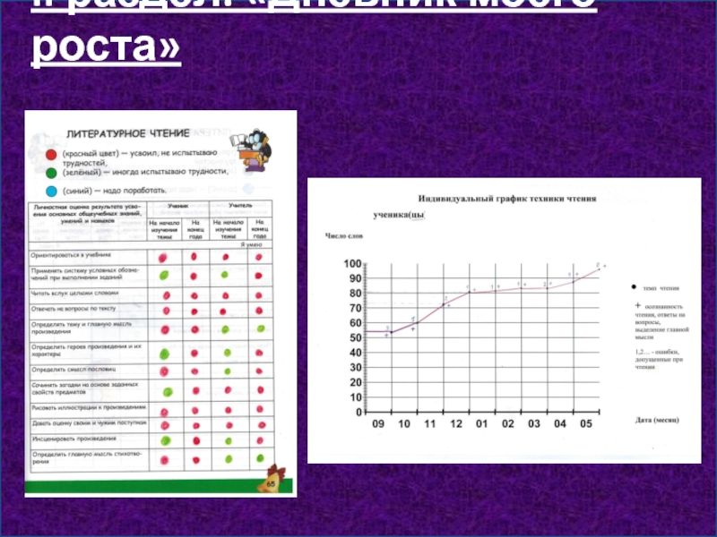 График продвижения по формированию и развитию навыка чтения (отмечается безошибочность, осознанность, беглость чтения); график строится на основе ежемесячной проверки техники чтения.