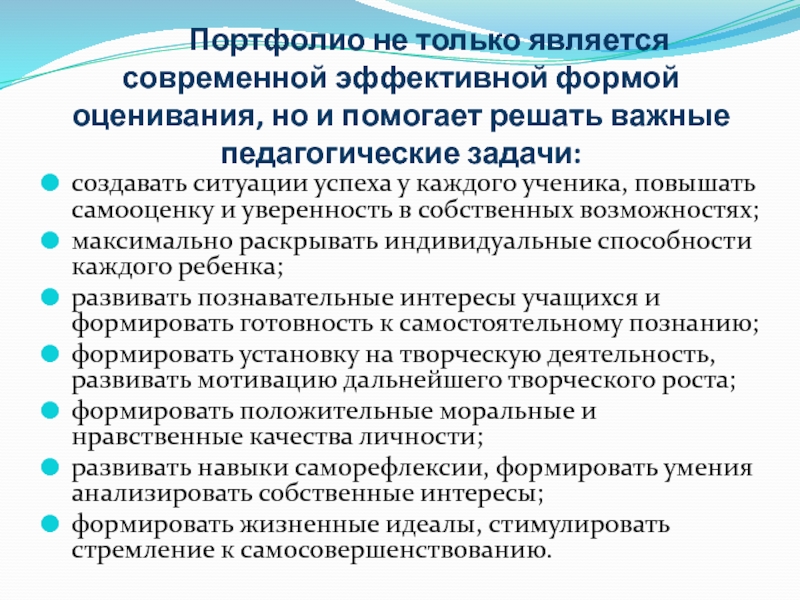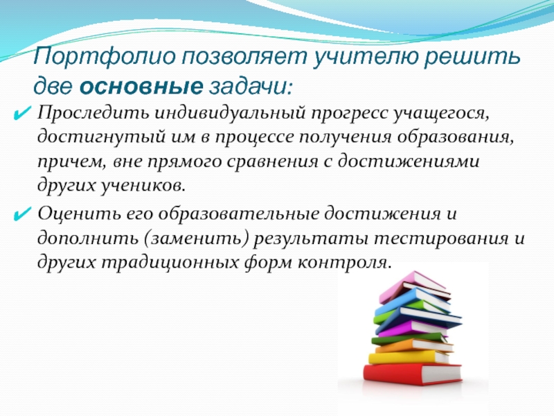 Слайд 7Портфолио позволяет учителю решить две основные задачи: