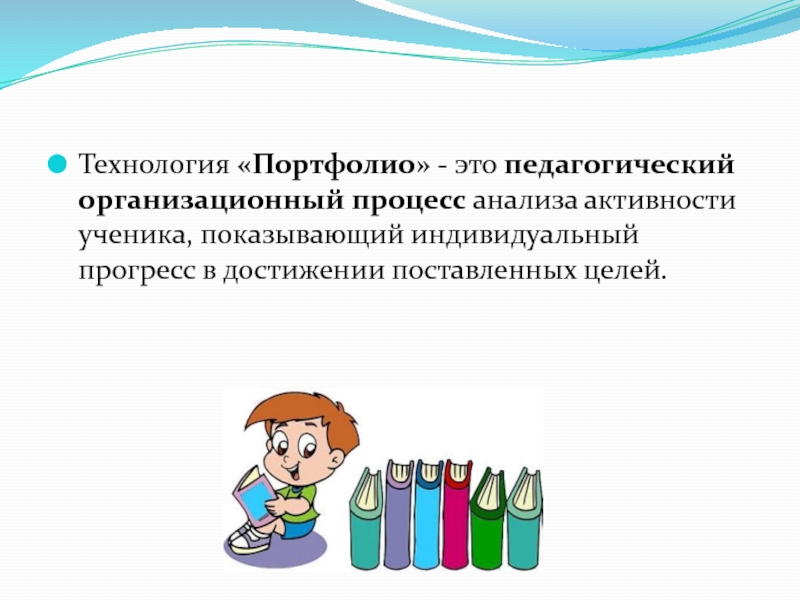 Слайд 3Технология «Портфолио» - это педагогический организационный процесс анализа активности ученика, показывающий