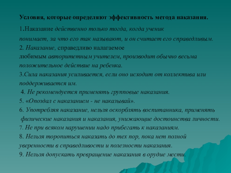 Слайд 9 Условия, которые определяют эффективность метода наказания. 1.Наказание действенно только тогда, когда ученик  понимает, за что его так называют, и он считает его справедливым.  2. Наказание, справедливо налагаемое любимым авторитетным учителем, производит обычно весьма  положительное действие на ребенка. 3.Сила наказания усиливается, если оно исходит от коллектива или  поддерживается им.