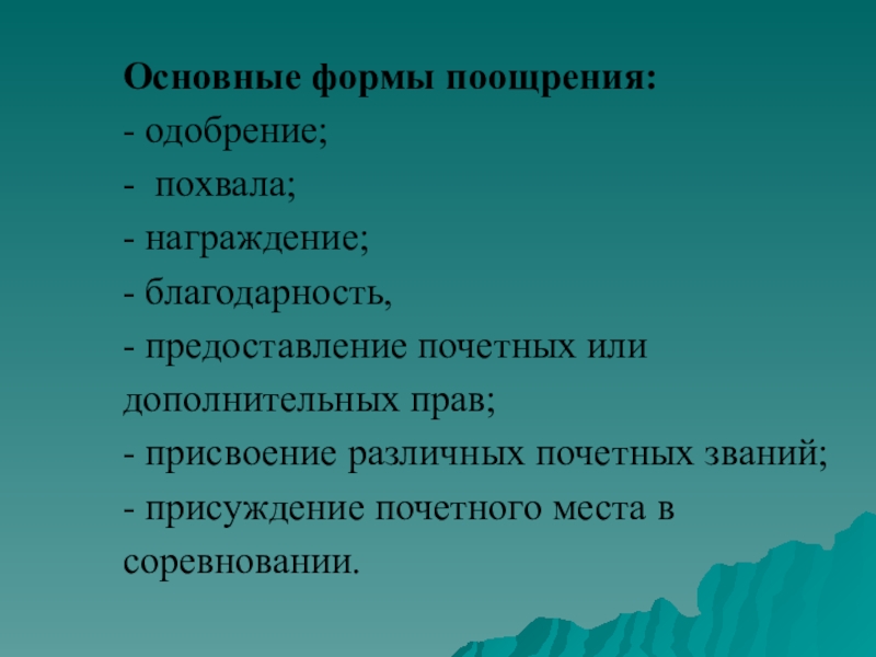 Слайд 6 Основные формы поощрения:  - одобрение; - похвала; - награждение; - благодарность, - предоставление почетных или дополнительных