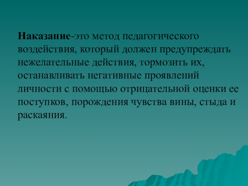 Слайд 3Наказание-это метод педагогического воздействия, который должен предупреждать нежелательные действия, тормозить их,