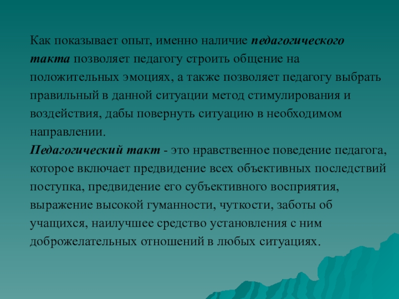 Слайд 11 Как показывает опыт, именно наличие педагогического такта позволяет педагогу строить общение