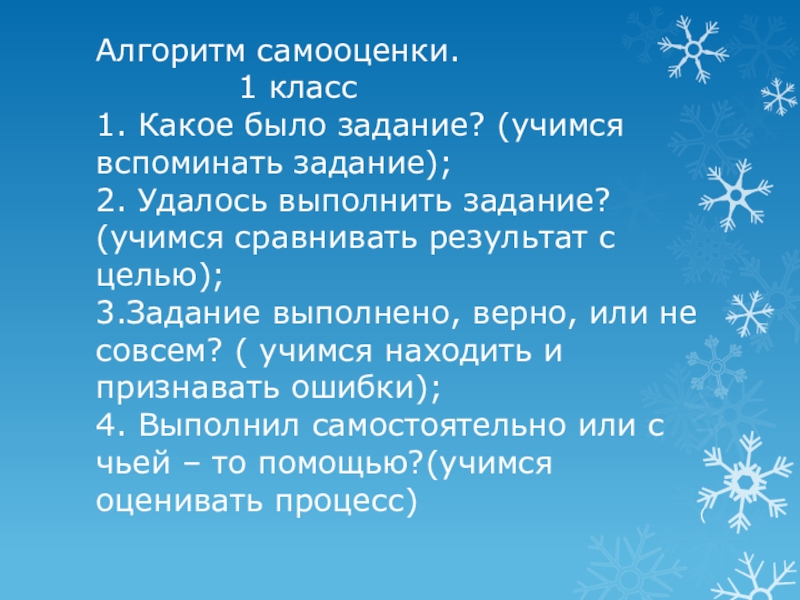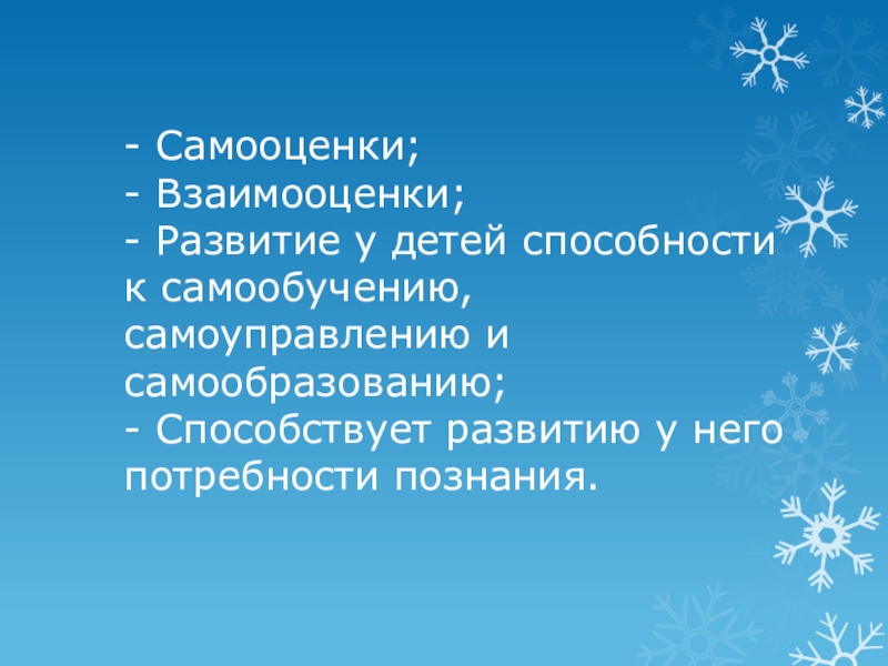 Система оценивания выстраивается таким образом, чтобы учащиеся включились в контрольно-оценочную деятельность, приобретая навыки и привычку к самооценке и взаимооценке.