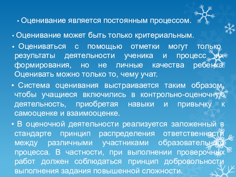 В оценочной деятельности реализуется заложенный в стандарте принцип распределения ответственности между различными участниками образовательного процесса. В частности, при выполнении проверочных работ должен соблюдаться принцип добровольности выполнения задания повышенной сложности.