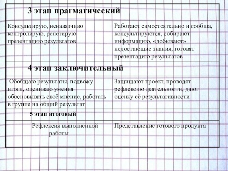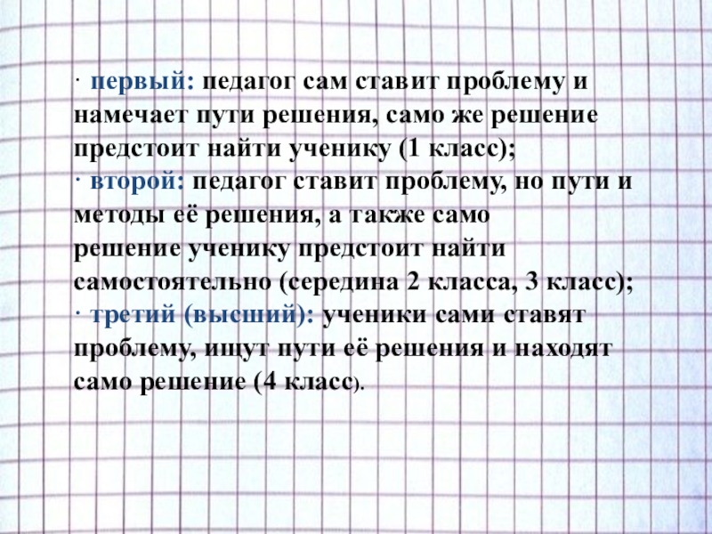 · третий (высший): ученики сами ставят проблему, ищут пути её решения и находят само решение (4 класс).