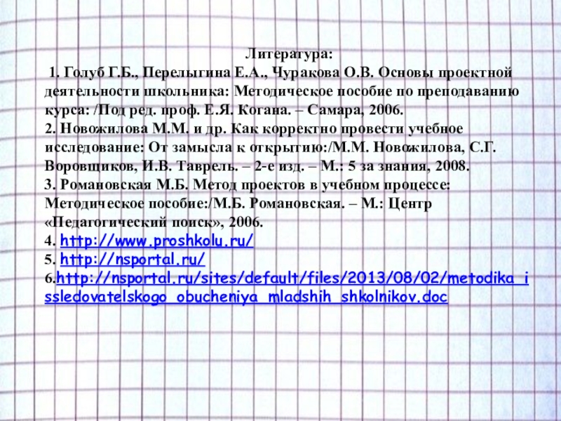2. Новожилова М.М. и др. Как корректно провести учебное исследование: От замысла к открытию:/М.М. Новожилова, С.Г. Воровщиков, И.В. Таврель. – 2-е изд. – М.: 5 за знания, 2008.