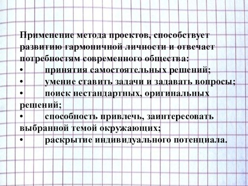 Слайд 9Применение метода проектов, способствует развитию гармоничной личности и отвечает потребностям современного