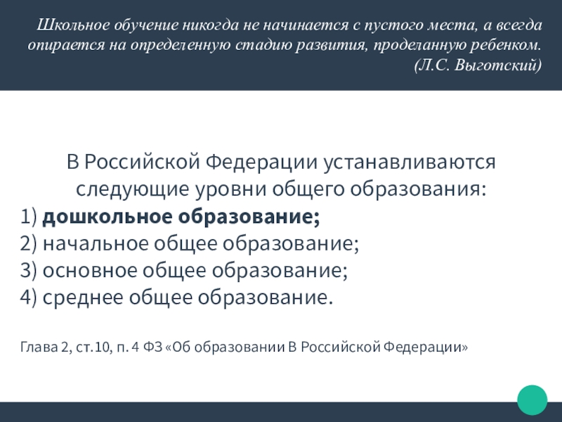 В Российской Федерации устанавливаются следующие уровни общего образования: