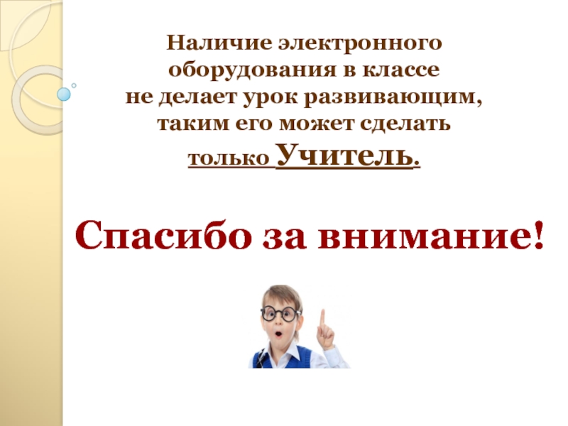 Спасибо за внимание!Наличие электронного оборудования в классе не делает урок развивающим, таким его может сделать только Учитель.