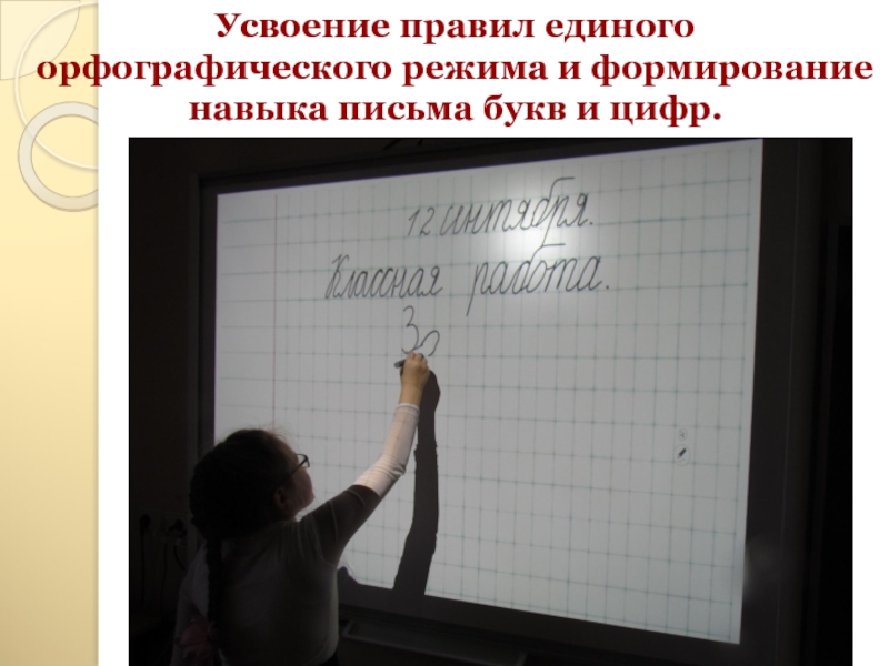 Усвоение правил единого орфографического режима и формирование навыка письма букв и цифр.
