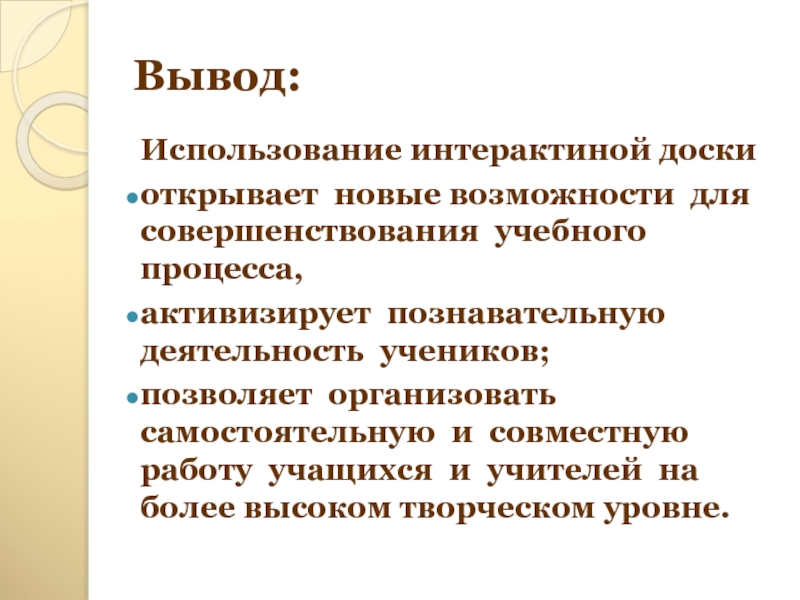 Вывод:Использование интерактиной доски открывает новые возможности для совершенствования учебного процесса, активизирует познавательную деятельность учеников;позволяет организовать самостоятельную и