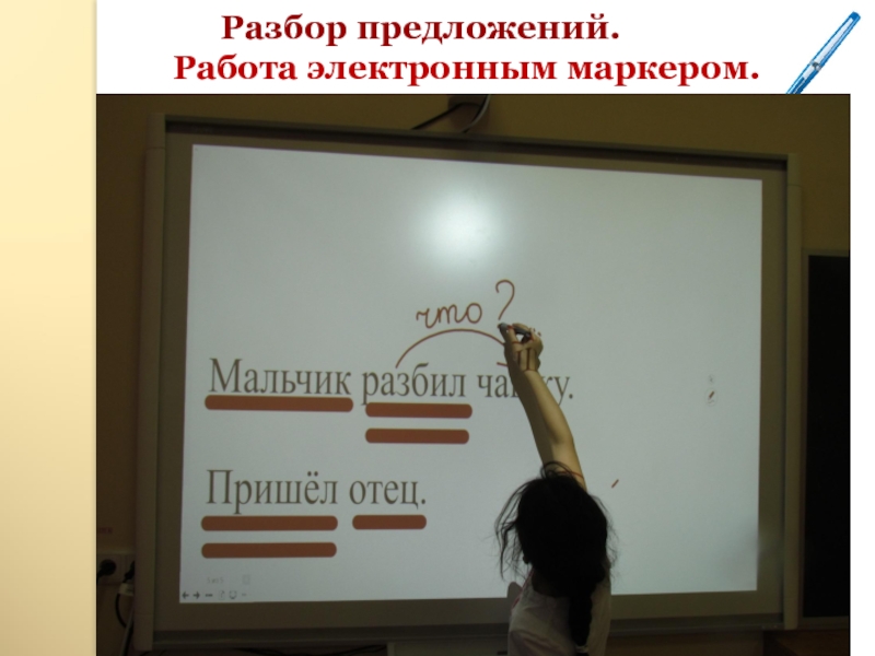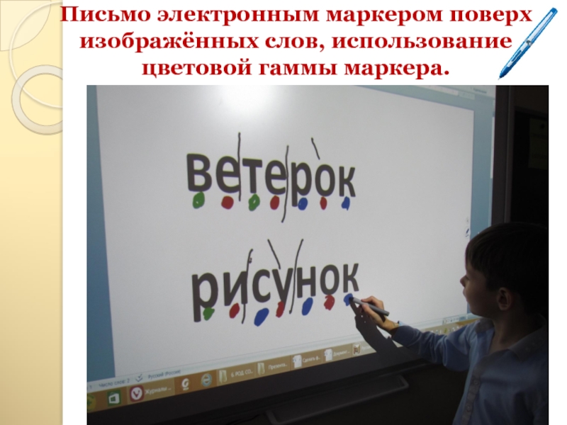 Слайд 11Письмо электронным маркером поверх изображённых слов, использование цветовой гаммы маркера.