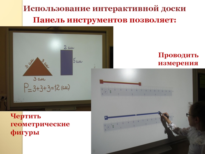 Использование интерактивной доскиПанель инструментов позволяет:Проводить измеренияЧертить геометрические фигуры