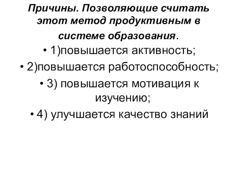 Причины. Позволяющие считать этот метод продуктивным в системе образования.1)повышается активность;2)повышается работоспособность;3) повышается мотивация к изучению;4) улучшается качество