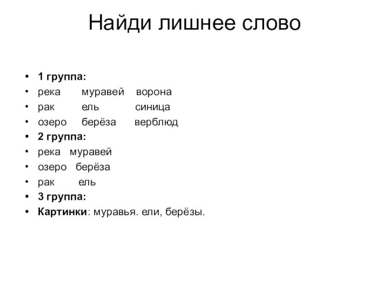 Найди лишнее слово 1 группа:река    муравей  воронарак     ель