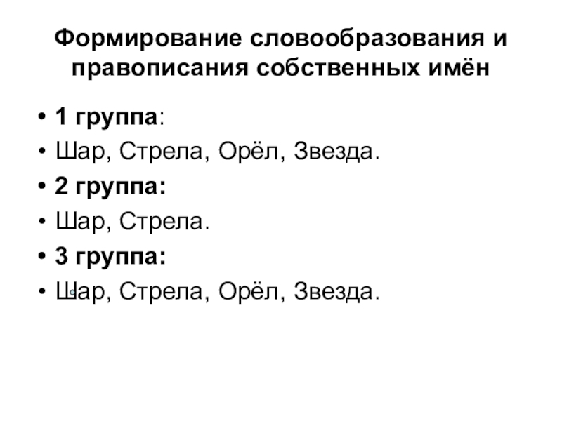 Формирование словообразования и правописания собственных имён1 группа:Шар, Стрела, Орёл, Звезда.2 группа:Шар, Стрела.3 группа:Шар, Стрела, Орёл, Звезда.