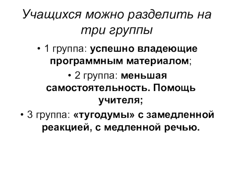 Учащихся можно разделить на три группы1 группа: успешно владеющие программным материалом;2 группа: меньшая самостоятельность. Помощь учителя;3 группа: