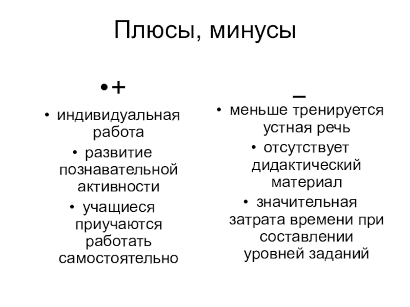 Плюсы, минусы+индивидуальная работаразвитие познавательной активностиучащиеся приучаются работать самостоятельно_меньше тренируется устная речьотсутствует дидактический материалзначительная затрата времени при составлении