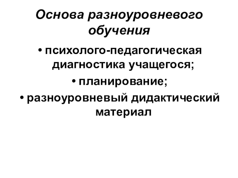 Основа разноуровневого обученияпсихолого-педагогическая диагностика учащегося;планирование;разноуровневый дидактический материал