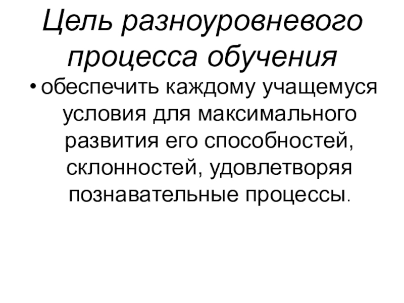 Цель разноуровневого процесса обученияобеспечить каждому учащемуся условия для максимального развития его способностей, склонностей, удовлетворяя познавательные процессы.