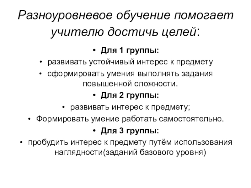 Разноуровневое обучение помогает учителю достичь целей:Для 1 группы:развивать устойчивый интерес к предметусформировать умения выполнять задания повышенной сложности.Для