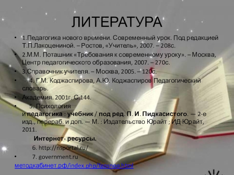 1.Педагогика нового времени. Современный урок. Под редакцией Т.П.Лакоцениной. – Ростов, «Учитель»,
