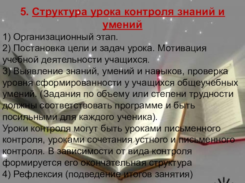 Уроки контроля могут быть уроками письменного контроля, уроками сочетания устного и письменного контроля. В зависимости от вида контроля формируется его окончательная структура