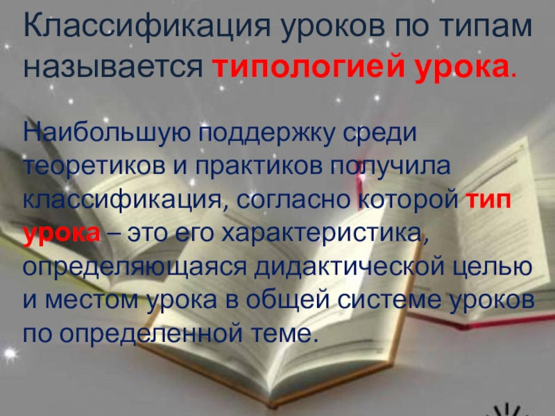 и практиков получила классификация, согласно которой тип урока – это его характеристика, определяющаяся дидактической целью и местом урока в общей системе уроков по определенной теме.