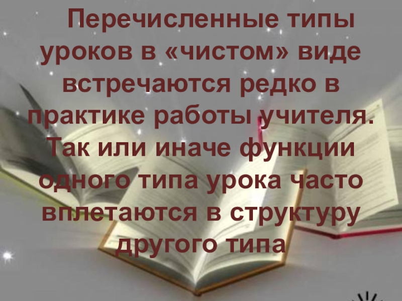 Слайд 22 Перечисленные типы уроков в «чистом» виде встречаются редко в практике работы