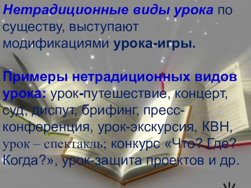 урок-путешествие, концерт, суд, диспут, брифинг, пресс-конференция, урок-экскурсия, КВН, урок – спектакль; конкурс «Что? Где? Когда?», урок-защита проектов и др.