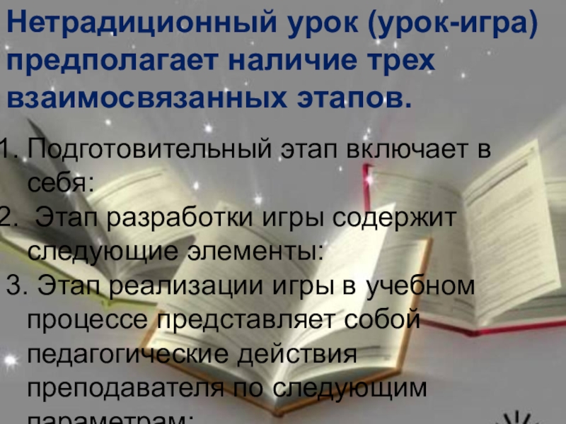 Нетрадиционный урок (урок-игра) предполагает наличие трех взаимосвязанных этапов.