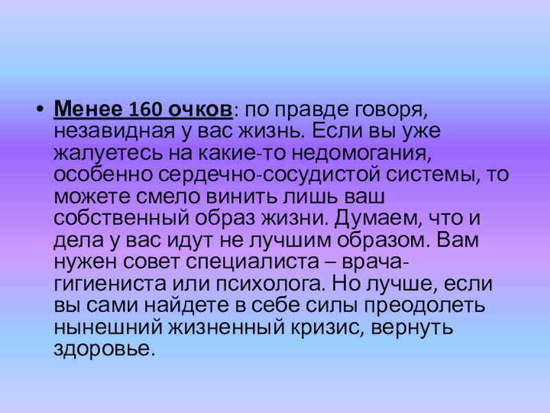 Слайд 59Менее 160 очков: по правде говоря, незавидная у вас жизнь. Если