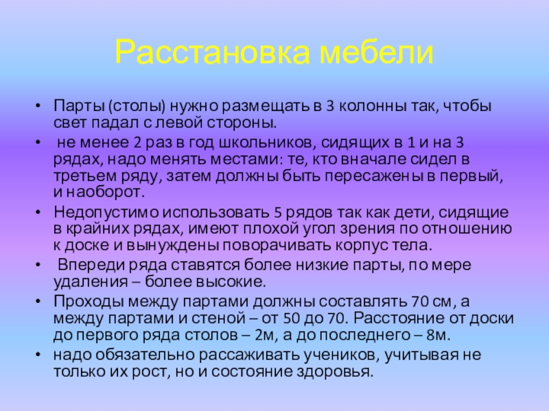 материально-технеческой базы школы санитарно-гигиеническим требованиям,( например столы, стулья в классе должны быть разной величины….)