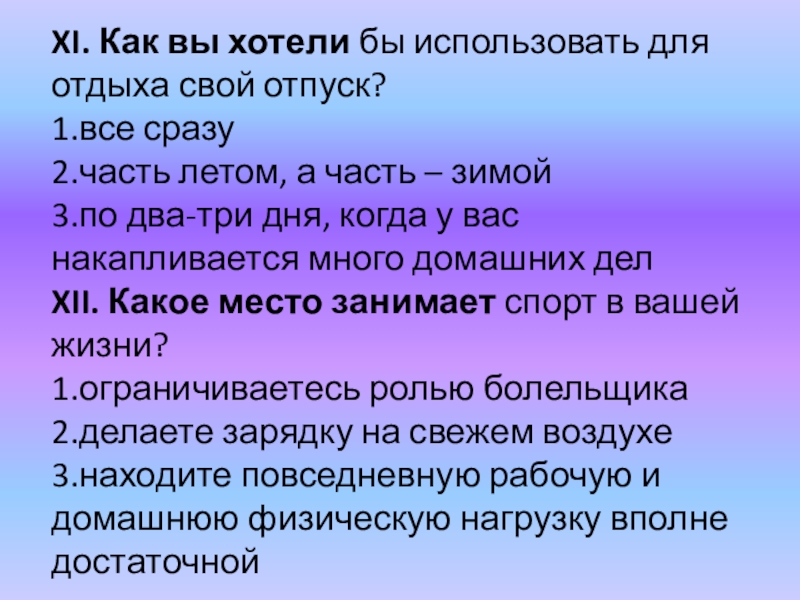 Слайд 53XI. Как вы хотели бы использовать для отдыха свой отпуск?